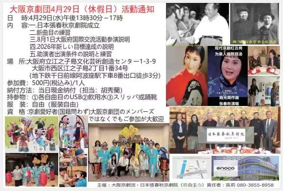 4月29日は祝日です。大阪京劇団4月のリハーサル日でもあり、団員の刁玉娟は司会のあいさつを告げて精気がいっぱいで、団員達はすばやく状態に入って、大いに興味を増し... -
